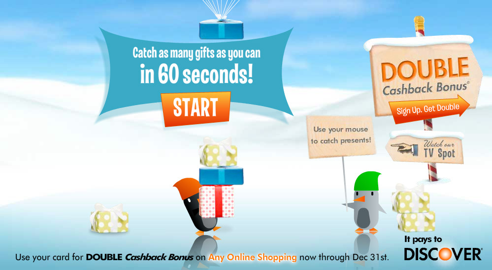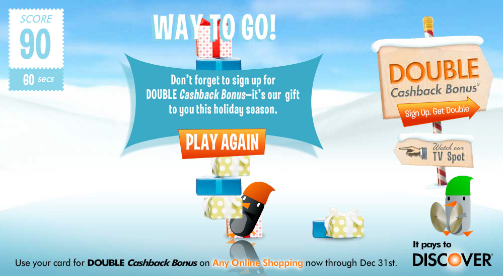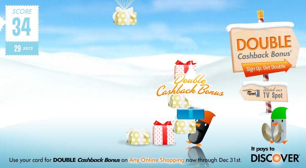 This ad campaign promoted double Cashback Bonus for the holiday season. We used two cute penguins to drive home the "double" aspect and had fun using them in page takeovers, mall signage, and standard animated display units.