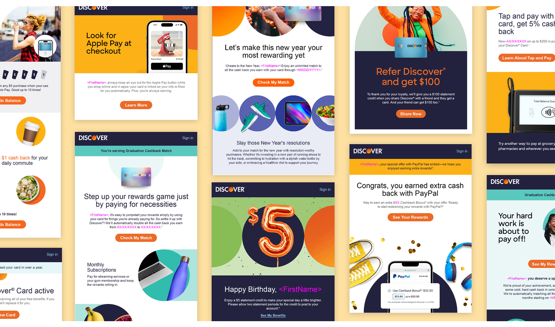 I've written and creative directed hundreds of different emails for many different Discover cardmember journeys, including card portfolio comms, acquisition, security products, student card, lifecycle emails, rewards engagement, and many others.