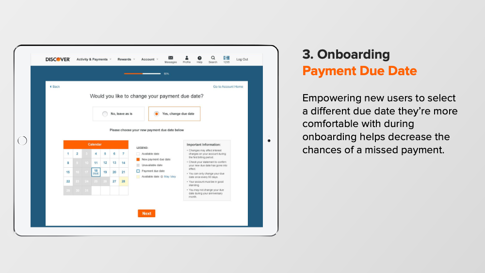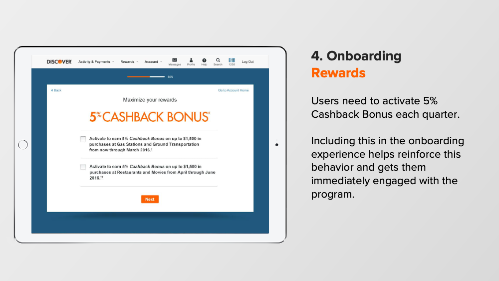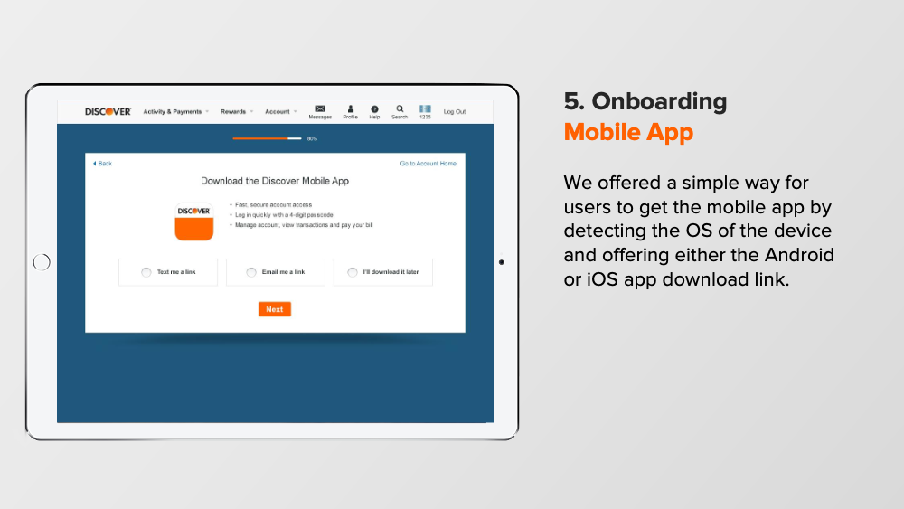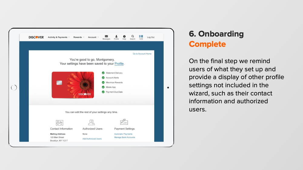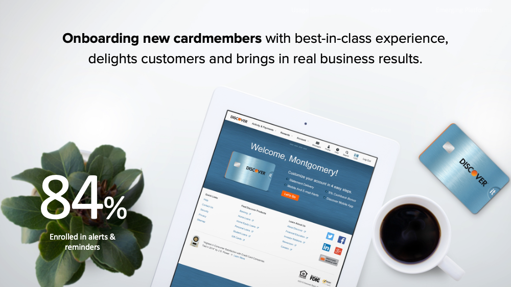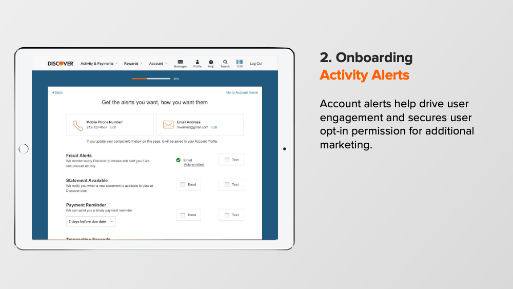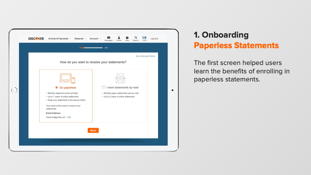 We helped Discover design, test, and implement an onboarding wizard. The goal is to improve enrollments in paperless statements, activity alerts, and rewards engagement. And it was highly successful in achieving all OKRs.